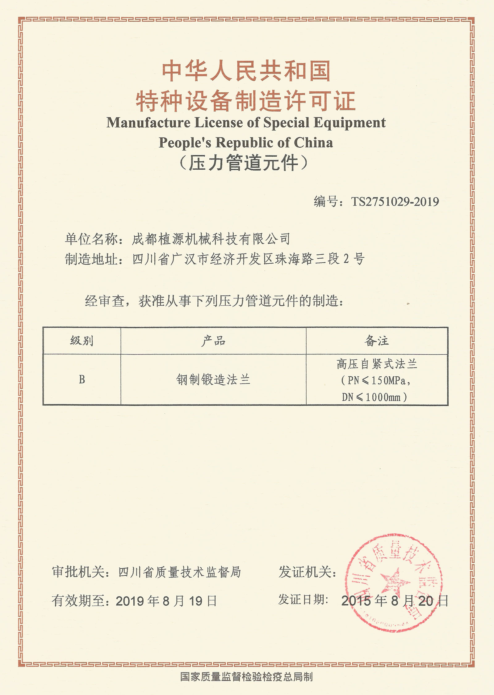 201574日—5日,四川省質(zhì)量技術(shù)監督局派出專(zhuān)家,組成評審組,對我司高壓自緊式法蘭ZY-LOC特種設備制造許可證換證、增項進(jìn)行了現場(chǎng)評審鑒定。最終,我司通過(guò)評審,繼續獲得B級壓力管道元件制造許可證,制造范圍增至:PN150MPa,DN1000mm。