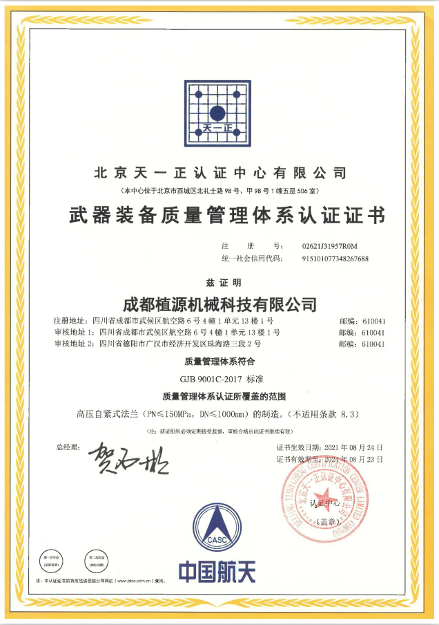 早在2018年,公司就曾成功申請了武器裝備質(zhì)量管理體系認證證書(shū)。多年來(lái),公司始終嚴格遵守GJB9001C-2017標準,在產(chǎn)品設計、采購、生產(chǎn)、檢驗、售后服務(wù)等環(huán)節都有一套完整的質(zhì)量管理體系。ZY-LOC高壓自緊式法蘭技術(shù),自出道就應用于國家高端項目中國神華煤直接液化制油工程項目上,口徑從DN10-DN1200,壓力PN85MPa,溫度t=700℃,材料包括碳鋼、不銹鋼、合金鋼等,使用至今無(wú)一例不良記錄。